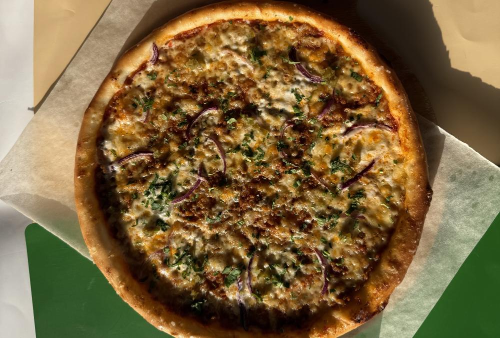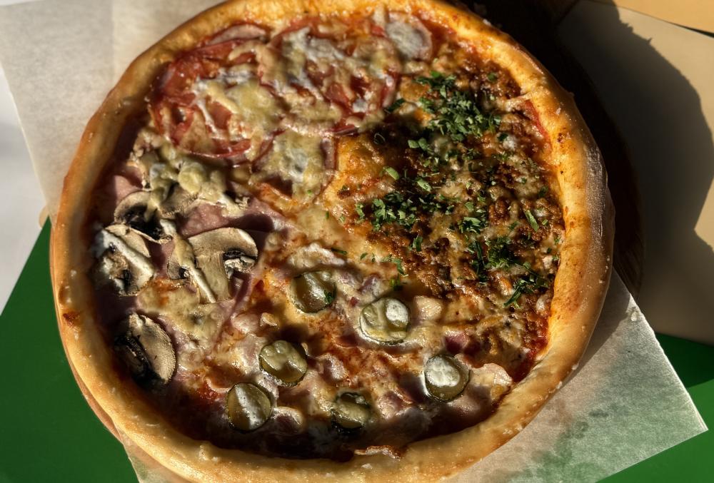 Тесто, бекон, огурчики маринованные, соус красный, карбонат, помидоры, фарш, лук красный, грибы, ветчина, сыр